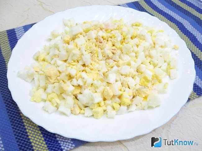 7. Яйця очистіть і наріжте такого ж розміру, як всі продукти.