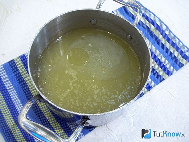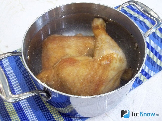 2. Копчені курячі стегенця вимити під проточною водою, оскільки продаються вони найчастіше не герметично закритих пакетах. Покладіть їх у каструлю, налийте питну воду і відваріть бульйон, близько 30 хвилин.