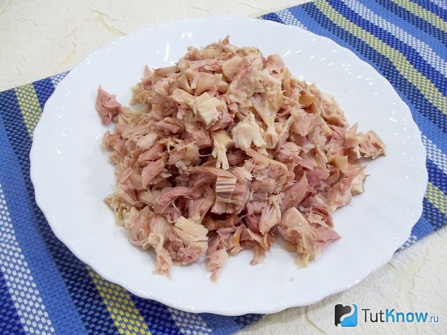 5. Коли всі продукти будуть охолоджені, починайте їх нарізати. М’ясо з курячого стегенця відокремити від кісток і наріжте шматочками близько 1 див.