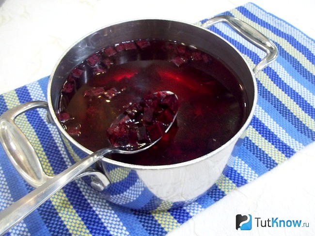 1. Буряк очистіть, помийте, наріжте кубиками, опустіть в каструлю, залийте водою, додайте оцет 9% і поставте варитися на плиту буряковий відвар до повної готовності буряків.