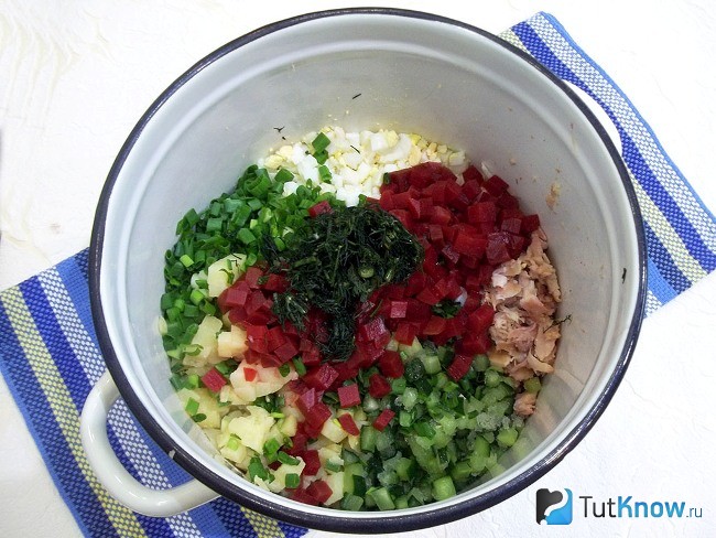 9. Всі продукти складіть у 5 л каструлю. Також туди покладіть нарізані кубиками огірки і подрібнений кріп. Я ці продукти використовувала заморожені.