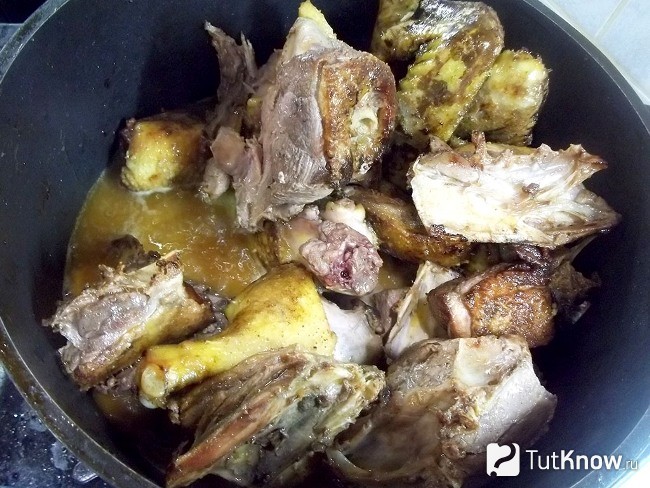 Візьміть важку каструлю з товстим дном і стінками. Добре підійде казан, чавунна каструля або вок. Налийте рослинне рафіноване масло і добре нагрійте. Після відправте смажитися птицю, встановивши великий вогонь, тоді качка зарум’яниться, що збереже в ній весь сік.
