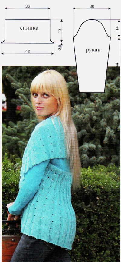 Набрати на спиці 41 п. і в’язати 4 ряди гумкою 1 на 1, далі в’язати лицьовій гладдю. Для розширення рукавів, з обох сторін, в кожному 10-му рядку 10 разів додати по 1 п. На висоті 44 см від набірного краю, для освіти оката рукава, з обох сторін закрити за 3 п. і в кожному 2-му ряду закрити 1 раз по 2 п., 18 разів по 1 п., 2 рази по 2 п. і закрити залишилися петлі.