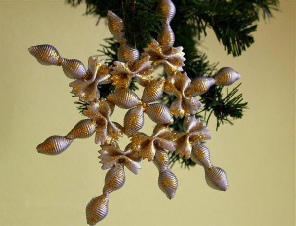 Пофантазуйте з наявними макаронами. Бантики, в’юшки, сіточки, черепашки – все це можна об’єднати в один ансамбль і створити приголомшливі сніжинки, гірлянди та іграшки. Щоб надати виробам оригінальності, пофарбуйте їх у цікаві кольори або покрийте білим.