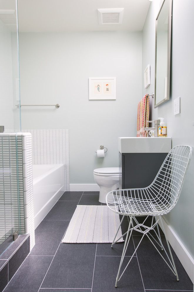 Замість масивного підлогового шафи під раковиною, використовуйте компактний підвісний аналог, а унітаз встановіть так, щоб між ним і сантехнікою навпаки, було достатньо місця для вільного проходу.