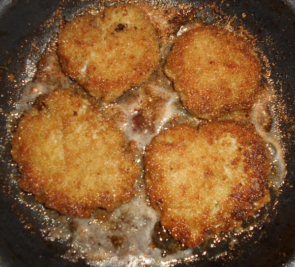 Сформувати котлети, обваляти їх у панірувальних сухарях і обсмажити на олії до утворення рум’яної скоринки.