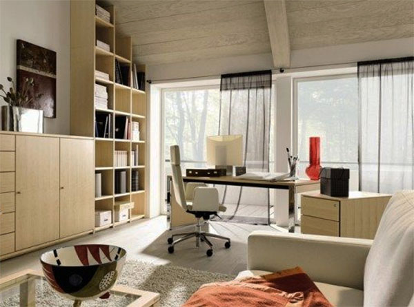 Для зручного розміщення оргтехніки – факсу, принтера і так далі, можна купити додатковий невисокий столик і поставити його неподалік від головного столу. Ну, і, звичайно, бажано, щоб в домашньому кабінеті був диванчик, на якому можна буде відпочивати або, зручно розташувавшись з друзями або діловими партнерами, спілкуватися. Поряд з диваном можна поставити торшер, а також журнальний або кавовий столик. Якщо ви любите пригощати гостей коньяком або віскі, то в зоні відпочинку можна помістити міні-бар – наприклад, пересувний, ну, а предмети декору вибирайте вже на власний розсуд. Але тільки не перестарайтеся і прийміть до уваги, що всі предмети меблів і декоративні елементи один з одним повинні органічно поєднуватися.