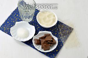 Вода 150 млЖелатин 5 пластинаЦукор 0.75 склянкиЦукор ванільний 10 гШоколад темний 80 г