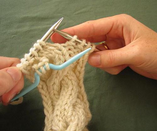 З урахуванням кромочних слід набрати 17 петель. Перші два ряди в’яжуть за схемою, потім приступають до вив’язування коси: 3 особових одягають на праву спицю без провязывания, 3 особових переносять на допоміжну спицю або в’язальну шпильку, повертають 3 особових з правої спиці на ліву, надягають на неї ж петлі з допоміжного інструменту, провязывают всі 6 особових. Таким чином, вийшло переплетення пасом з нахилом вправо.