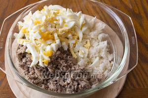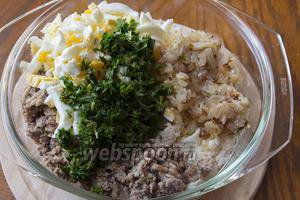 Варені яйця також дрібно порізати і додати в загальну масу.