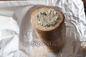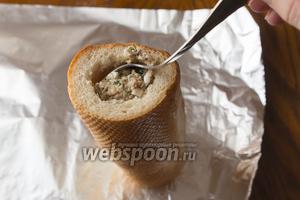 Візьмемо нашу трубочку з батона і поставимо на фольгу. Починаємо акуратно, ложкою, утрамбовувати начинку. Головне — не перестаратися, щоб не порвалися стінки.
