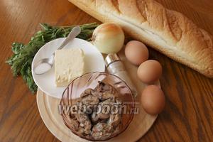 Що нам знадобиться для цього рецепта: батон довгий, вузький, але не французький, яйця, масло вершкове, рибні консерви в олії на ваш смак, цибуля ріпчаста, зелень кропу і петрушки, сіль і перець.
