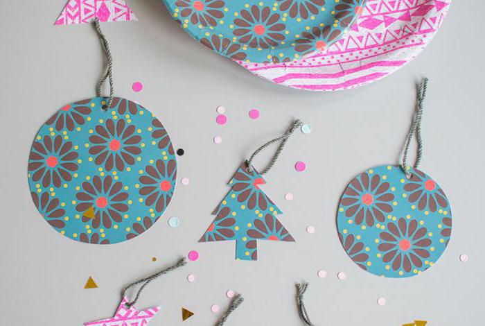 З паперу виходять деколи дивно красиві речі. Наприклад, якщо ви візьмете декоративний картон або листи для декупажу або крафтінга і просто виріжте якісь новорічні силуети (кулька, оленя, ялинку, зірочку, Діда Мороза і так далі), зробіть невеликий отвір за допомогою діркопробивача чи шила і проденете красиву стрічку або мотузку, то у вас вийдуть чудові ялинкові прикраси. Достатньо, щоб на них не потрапляла волога, і такі вироби можуть легко зберігатися не один рік.