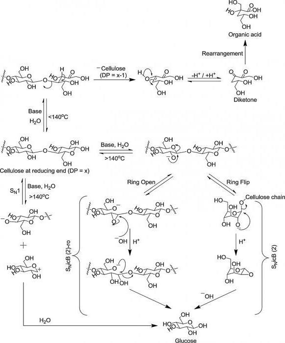 Наведено отримання глюкози (формула) з целюлози. На ділі ж цей процес набагато складніший і энергозатратнее. Отже, продуктом, який вступає в реакцію, є відходи деревопереробної промисловості, подрібнені до фракції, розмір частинок в якій 1,1 – 1,6 мм. Даний продукт обробляється спершу оцтовою кислотою, потім перекисом водню, потім сірчаною кислотою при температурі не нижче 110 градусів і гидромодуле 5. Тривалість цього процесу 3-5 годин. Потім, протягом двох годин проходить гідроліз сірчаної кислотою при кімнатній температурі і гидромодуле 4-5. Потім відбувається розбавлення водою і інверсія протягом приблизно півтори години.