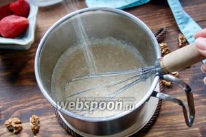 Далі тонкою цівкою всипаємо манну крупу, постійно помішуючи, щоб не утворювалися грудочки. Варимо до загустіння 3-5 хвилин.