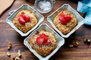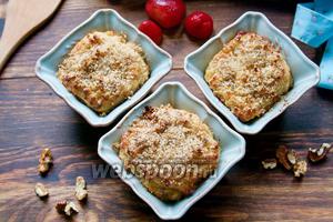 Тепер маса готова до запіканню. Викладаємо кашу в змащену форму, сковороду або порціонні формочки, як у мене. Посипаємо тертими горіхами (за бажанням) і цукром (зовсім трохи, для скоринки, так як каша досить солодка). Відправляємо в духовку на 30-45 хвилин. Час залежить від вашої духовки. Я в кінці включила на 2 хвилини гриль, щоб цукор карамелізувався, але це можна пропустити, так як каша і так виходить «рум’яна»)).