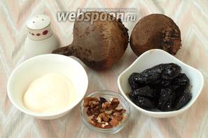 Для приготування салату нам знадобиться 2 середніх буряків, чорнослив, волоські горіхи, сіль і майонез. При бажанні майонез можна замінити сметаною чи густим йогуртом.
