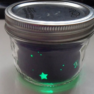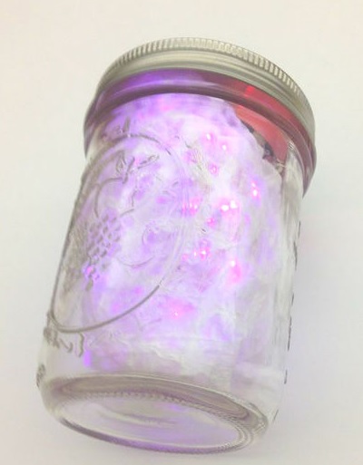 Для цієї мети знадобитися велика трилітрова скляна банка, напівпрозора тканина (наприклад органза) і ялинкова гірлянда. Лампочки на гірляндах повинні бути одного кольору, бажано щоб вони були фіолетові або блакитні. Проробіть в кришці банки невелику малопомітну дірку, через яку буде витягнений шнур від гірлянди і підключений до розетки. Оберніть гірлянду напівпрозорою тканиною і покладіть в банку. Таким чином світло від лампочок стане розмитим і загадковим. Дивлячись на такий світильник, відразу не можна буде зрозуміти що знаходиться в банку.