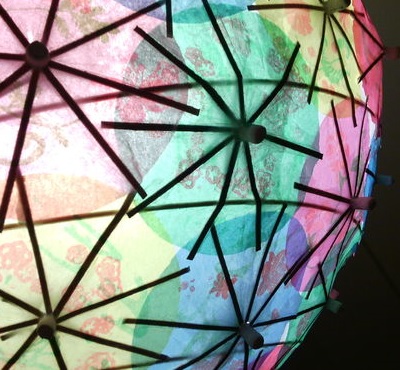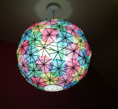 Зробіть каркас для абажура круглої форми з тонких дерев’яних балок або дроту. Візьміть будівельний скотч білого кольору і обклейте їм каркас. Візьміть упаковку різнокольорових парасольок для коктейлю і застроміть з скотч. Заповніть простір так, щоб не залишилося білих плям. Після того як ви лампу помістіть всередину, вона буде створювати кольоровий світ, просвічуючи через парасольки.