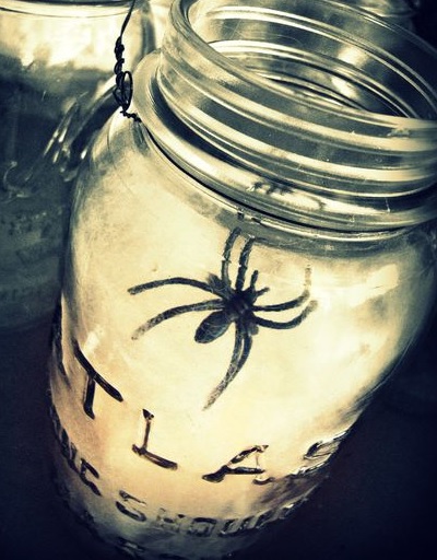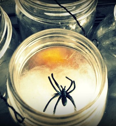 Робиться так само, як і попередня лампа. Візьміть гірлянду зі світлими лампочками, оберніть її напівпрозорою тканиною і покладіть в банку. Можна додати кілька шматків вати з боків. Зверху помістіть невелику іграшку у вигляді чорного павука. Не закривайте банку кришкою, щоб створилася ілюзія того, що комаха може вистрибнути у будь-яку хвилину. Здалеку така лампа буде виглядати дуже переконливо.