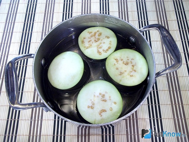 1. Баклажани помийте, розріжте хвостик, плід розріжте на 4 частини і опустіть в підсолену воду. Залиште їх на 30 хвилин, щоб з них вийшла вся гіркота. Потім злийте воду, залийте плоди свіжою і відваріть після закипання 15 хвилин.