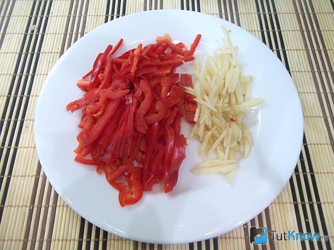 5. З солодкого перцю зріжте хвостик, видаліть перегородки з насінням і наріжте соломкою. Часник очистіть від шелуши і подрібніть.