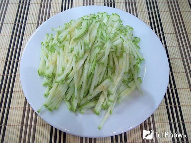 3. Кабачок вимити, висушити і наріжте тонкою соломкою. Якщо його плоди використовуєте старі, то зріжте шкірку і видаліть насіння. Але краще застосовувати його молодий.