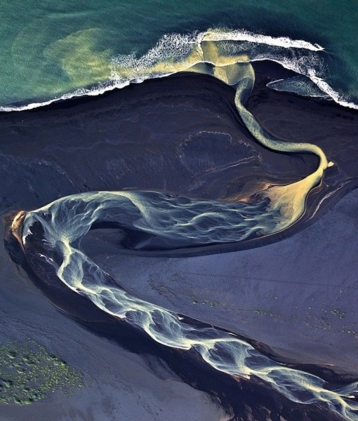«Ісландія – чудова країна. Я б навіть сказав, що це справжній рай для всіх любителів познімати. Але для мене справжнім відкриттям став вид з повітря на річки, що текли по чорному вулканічному піску. Це неймовірне поєднання кольорів, ліній і візерунків. На фото представлено гирло річки, що впадає в океан. Трохи вище по течії в річку впадає жовтий струмок, однак жовті потоки не можуть змагатися з головним кольором. На чорному піску чітко видно сліди від автомобілів, так що по них можна судити про розміри. Просто річка, просто вулкан, просто наша планета».