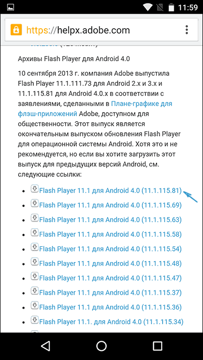 Перший крок — завантажити Flash Player апк в останній його версії для Android з офіційного сайту Adobe. Для цього перейдіть на сторінку архівних версії плагіна https://helpx.adobe.com/flash-player/kb/archived-flash-player-versions.html після чого у списку знайдіть розділ Flash Player for Android 4 і завантажте самий верхній екземпляр апк (версія 11.1) зі списку.