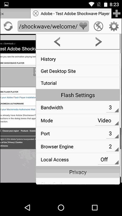 Також через Dolphin ви зможете відкрити і змінити настройки Flash для Android (викликаються запуском відповідної програми на телефоні або планшеті).