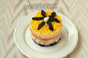 Верх салату прикрасити чорносливом і акуратно зняти форму. При подачі додати в салат листочки петрушки. Приємного апетиту!