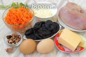 Індиче філе 200 гМайонез 150 гМорква по-корейськи 100 гГоріхи волоські 30 гПетрушка свіжа 1 гілочкаСіль 1 ч. л.Сир твердий 60 гЧорнослив в’ялений 80 гЧасник 1 зубчикЯйця курячі 2 шт.