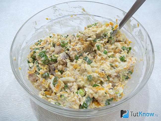 7. У миску покладіть всі підготовлені продукти і додайте до них майонез.