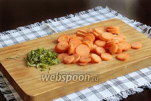 Моркву нарізати тонкими кільцями, кінзу або петрушку дрібно порубати.