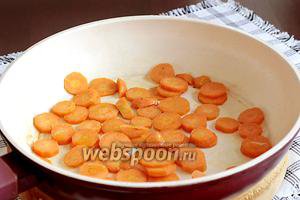 У розігріту сковороду додати 4 столових ложки води і 1 ложку оливкової олії. Пригасити моркву до стану «аль денте», іноді помішуючи, протягом 3-5 хвилин. Можна обійтися і без води, додавши більше масла, кому як подобається. Морква стає м’якше, злегка рум’яниться, але все ж залишається щільною і добре тримає форму. Злегка підсолити її за смаком.