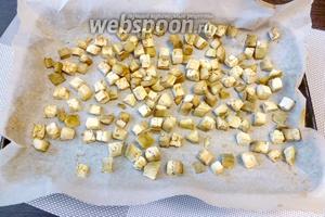 Подвялим баклажанові кубики в духовці 15 хвилин при температурі 190°С. Цього достатньо, щоб вони приготувалися і стали м’якими. Нехай охолонуть.