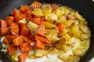 У гарячу сметану викладіть запечені овочі. Трохи посоліть (1 ч. л.), з урахуванням того, що гарбуз і картоплю вже подсаливались. Перемішайте.