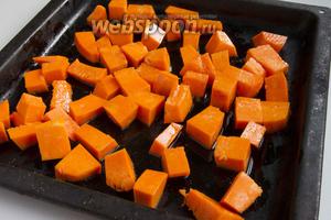 У гарбуза (400 г) зріжте шкірку, м’якоть наріжте великими скибочками. Полити 1 столовою ложкою рослинної олії. Посоліть за смаком. Перемішайте, бажано руками. Викладіть гарбуз на деко Запечіть до м’якості і рум’яності.