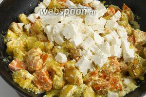 Додайте 250 г адигейського сиру, нарізаного невеликими кубиками. Якщо сметана густа і сабджі виходить сухуватим, можна додати трохи води.
