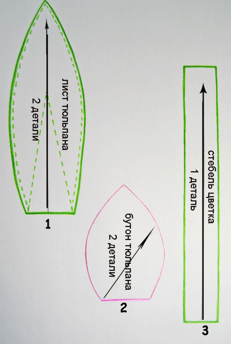 1. З допомогою картинки викроїти потрібну кількість тюльпанів. Довжину стебла потрібно регулювати під обрану вазу – укоротити, подовжити або залишити колишньою. Кількість листочків, також можна самостійно вибирати – необов’язково викроювати рівну кількість бутонів і листів, але якщо їх мало, то букет буде виглядати «лисим». При викроювання деталей залишаєте трохи місця для припусків.