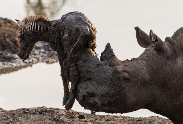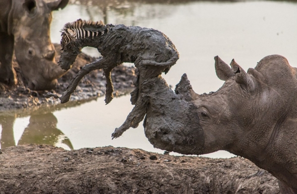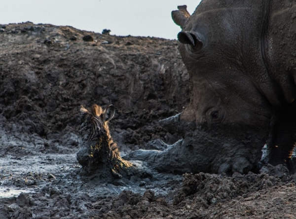 Фотограф дикої природи Roel van Muiden зняв дивовижні кадри в Південній Африці. Лоша зебри намертво застряг у багнюці, носоріг побачив малюка і вирішив його дістати, але не все так благополучно…