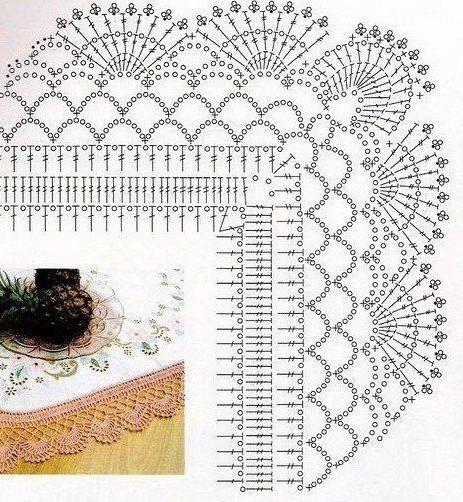 Ажурна облямівка для гачком скатертини (схеми повинні бути узгоджені зі стилістикою і орнаментом основного полотна скатертини) може бути пов’язана по колу або із застосуванням прямих кутів, так само, як і облямівка для обробки країв серветок.
