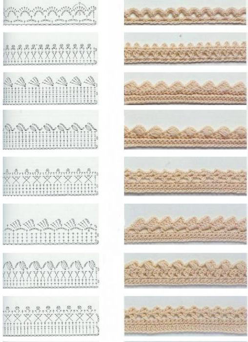 Мереживна облямівка гачком (схеми деяких орнаментів представлені нижче) дуже прикрашає одяг. Її використовують для оформлення нижнього краю виробу, рукавів і горловини. Досить часто сам виріб в’яжуть простим нескладним візерунком, а основний акцент зміщують саме на мереживну облямівку. Це актуально для спідниць, суконь, сумок і пуловерів.