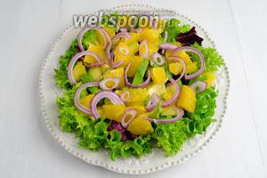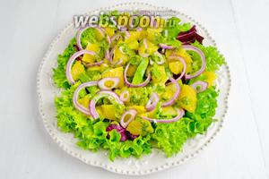 Зверху листя розкласти скибочки авокадо і апельсина.