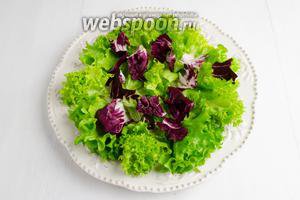 Листя салату (1 пучок зеленого і 10 г радичио) вимити, обсушити. Порвати великими шматками. Викласти на дно тарілки.