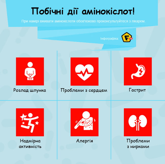 Шкідливими властивостями амінокислоти володіють, якщо їх неправильно приймають. До числа побічних ефектів відноситься млявість, апатія, порушення працездатності серця, нирок, печінки, органів травлення. Негативний вплив на організм препарати роблять при наявності проблем зі здоров’ям. Наприклад, якщо виявлено гастрит чи інші захворювання, пов’язані з шлунково-кишковим трактом, то амінокислоти стануть причиною загострення симптоматики.