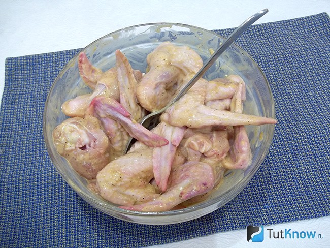 Підберіть підходящу ємність, в яку помістяться всі крила, і помістіть їх в неї. Залийте крильця маринадом і перемішайте, щоб кожен шматочок був добре покритий соусом. Оберніть тару харчовою плівкою і залиште маринуватися крила на 1 годину при кімнатній температурі. Якщо будете маринувати їх більш тривалий час, то відправте продукт в холодильник.