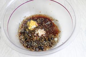 Для маринаду змішуємо гірчицю (1 ч. л.), масло (30 мл), цукор (2 ст. л.), сіль (0,5 ч. л.), спеції (5 г) і оцет (50 мл). З 1 лимона видавимо сік. І часник (2 зубчики) видавлюємо теж.