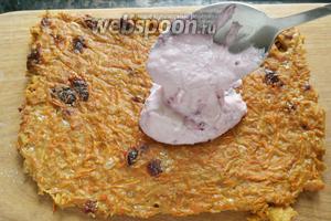 Корж розрізаємо на 2 частини і змащуємо кремом.
