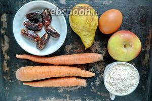 Морква 300 гБорошно цільнозернові 100 гв’ялені Фініки 50 гЯблуко 300 гЯйця курячі 3 шт.